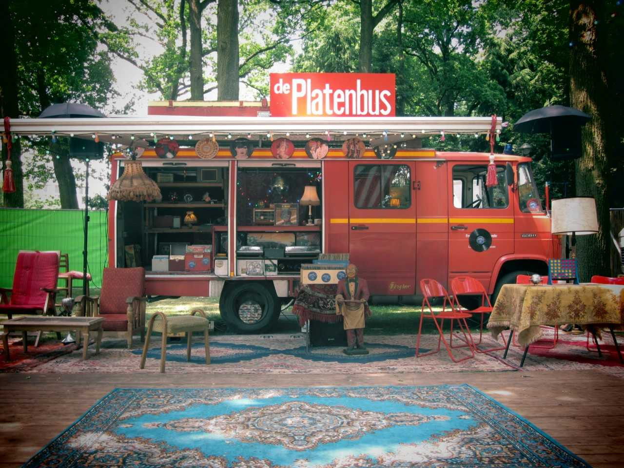 De Platenbus is een Oldtimer brandweerwagen van waar uit lekker ouderwets plaatjes worden gedraaid. Muziek vanaf de jaren '30, van soul tot jazz, Frans tot Afrikaans. Het swingt en blijf toch relaxt. Met rondom tapijten, schemerlampen en zitjes ontstaat er een open huiskamer dat als rustpunt kan dienen voor vermoeide voeten. Maar als het feest drijgt te worden, gaan de stoelen aan de kant en de beentjes van de vloer.