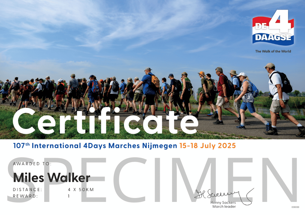 If you complete the 4Days Marches, the certificate will be sent to you by mail within a few weeks after the event. If your participation in the 4Days Marches is not successful, you will not receive a certificate, and it will not be possible to refund the paid amount.