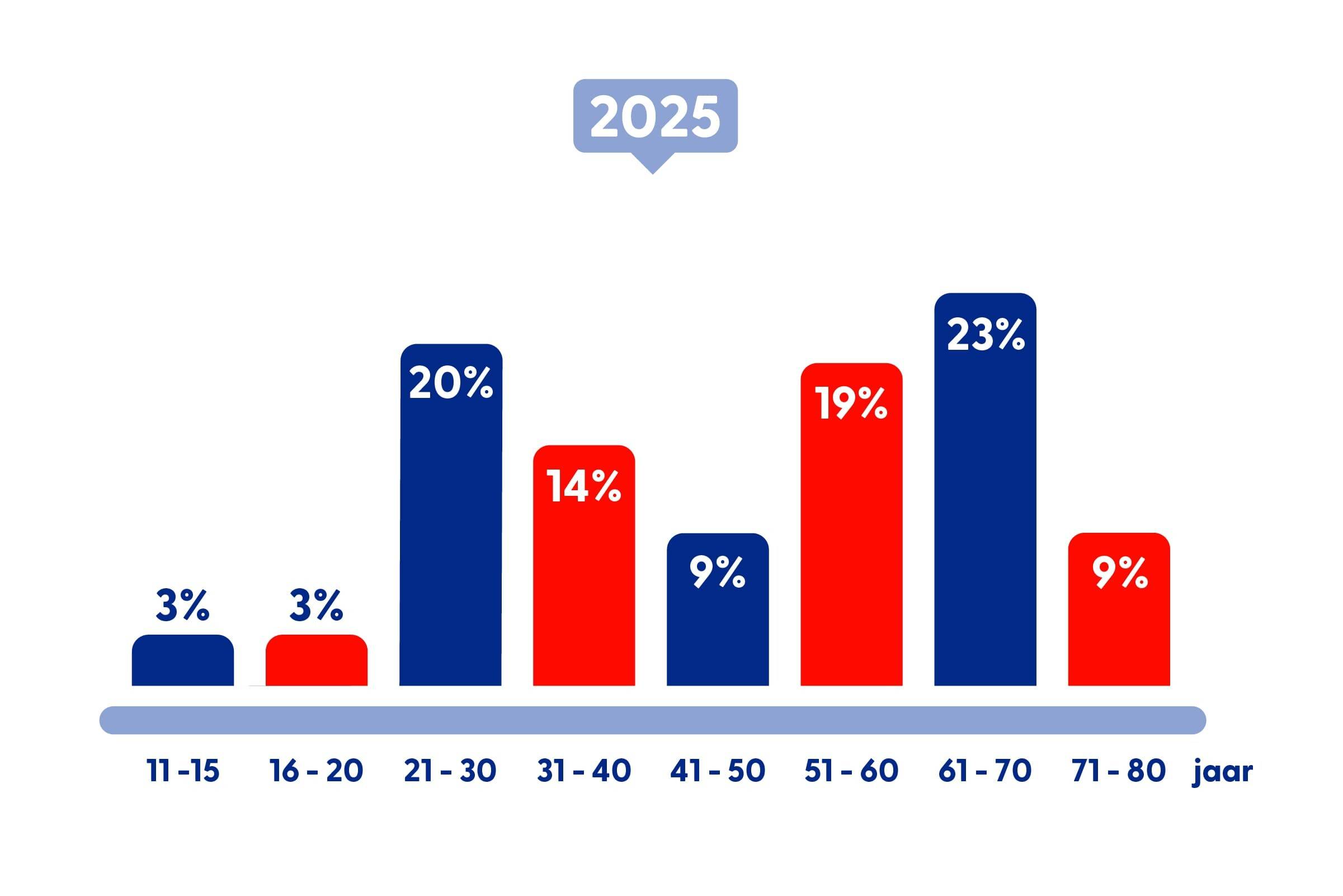 De 4Daagse verbindt. Op het parcours ontmoet je niet alleen deelnemers met uiteenlopende nationaliteiten en verschillende achtergronden, ook lopen wandelaars van alle leeftijden zij aan zij. Van 11 jaar tot 90 plus, allemaal met hetzelfde doel: het behalen van het felbegeerde 4Daagsekruisje. Je leeftijd (en geslacht) bepalen welke afstand jij minimaal moet lopen. Lees meer...